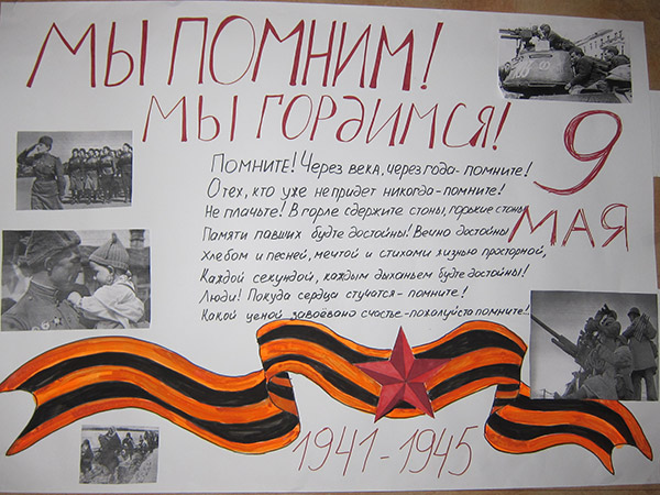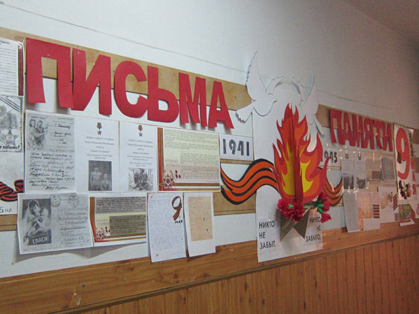 В фойе лицея выставлены многочисленные работы детей, плакаты, рисунки, которые вызывают интерес у всех . Ученики 10А класса оформили в галерее школы замечательный стенд «Письма памяти», на котором были представлены семейные реликвии – письма с фронта. Учащиеся 9А класса провели акцию « Открытка ветерану», во время которой открытки, сделанные своими руками, были подарены 9 Мая ветеранам войны. Силами ребят из 6Б,8Б и 9А класса были созданы плакаты «Этих дней не смолкнет слава!».